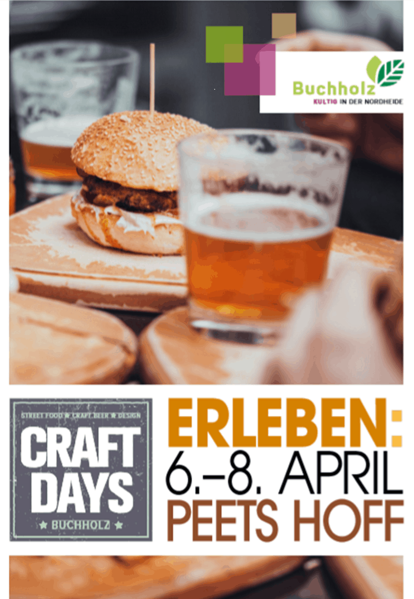 Handgemachtes steht im Vordergrund. Individuelle Angebote, gute Qualität und tolle Stimmung zeichnen die Buchholzer Craft Days aus. Gutes Essen, Angeboten aus unterschiedlichsten Foodtrucks und frisch gezapftes Craftbeer laden zum Schlemmen und Genießen ein. Dazu etwas Kunsthandwerk. Also ein Marktwochenende für Jedermann.