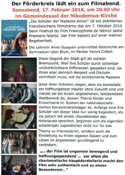 | FreeAm 17. Februar findet im Gemeindesaal der Nikodemus-Kirche in Handeloh ein Filmabend mit Getränken und kleinen Knabbereien statt.