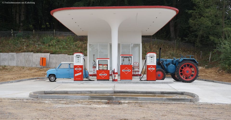 Das Freilichtmuseum hat die Tankstelle im Rahmen des Projekts „Königsberger Straße“ aufgebaut, das zeigt, wie sich das Leben in der Zeit von 1949 bis 1970 entwickelte. Museumsdirektor Stefan Zimmermann erläutert: „Die Tankstelle haben wir im Jahr 2018 aus Stade geholt. Wir haben sie in den Zeitschnitt von 1955 zurückversetzt – mit den charakteristischen Gasolin-Farben rot-weiß. In unserer ‚Königsberger Straße‘ verdeutlicht sie die großen Veränderungen, die sich durch den steigenden Individualverkehr während Wiederaufbau und Wirtschaftswunder auch auf dem Lande einstellten.“ Die Tankstelle ist das erste Gebäude, das in der neuen „Königsberger Straße“ fertiggestellt wird. Weitere fünf Gebäude – zwei Siedlungshäuser, ein Geschäftshaus ein Fertighaus und ein kleiner Bauernhof – werden bis 2023 aufgebaut.