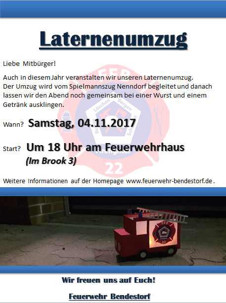 | FreeDer traditionelle Laternenumzug der Freiwilligen Feuerwehr Bendestorf findet am 4. November um 18.00 Uhr statt. Für die Musik während des Umzugs sorgt der Spielmannszug Nenndorf. Im Anschluss gibt es ein gemütliches Beisammensein am Feuerwehrhaus mit Speisen und Getränken.