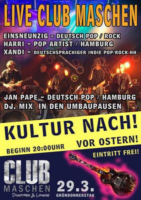 Am 29. März ist im Club Maschen das erste Mal ein Abend mit Livemusik und verschiedenen Künstlern und Bands.