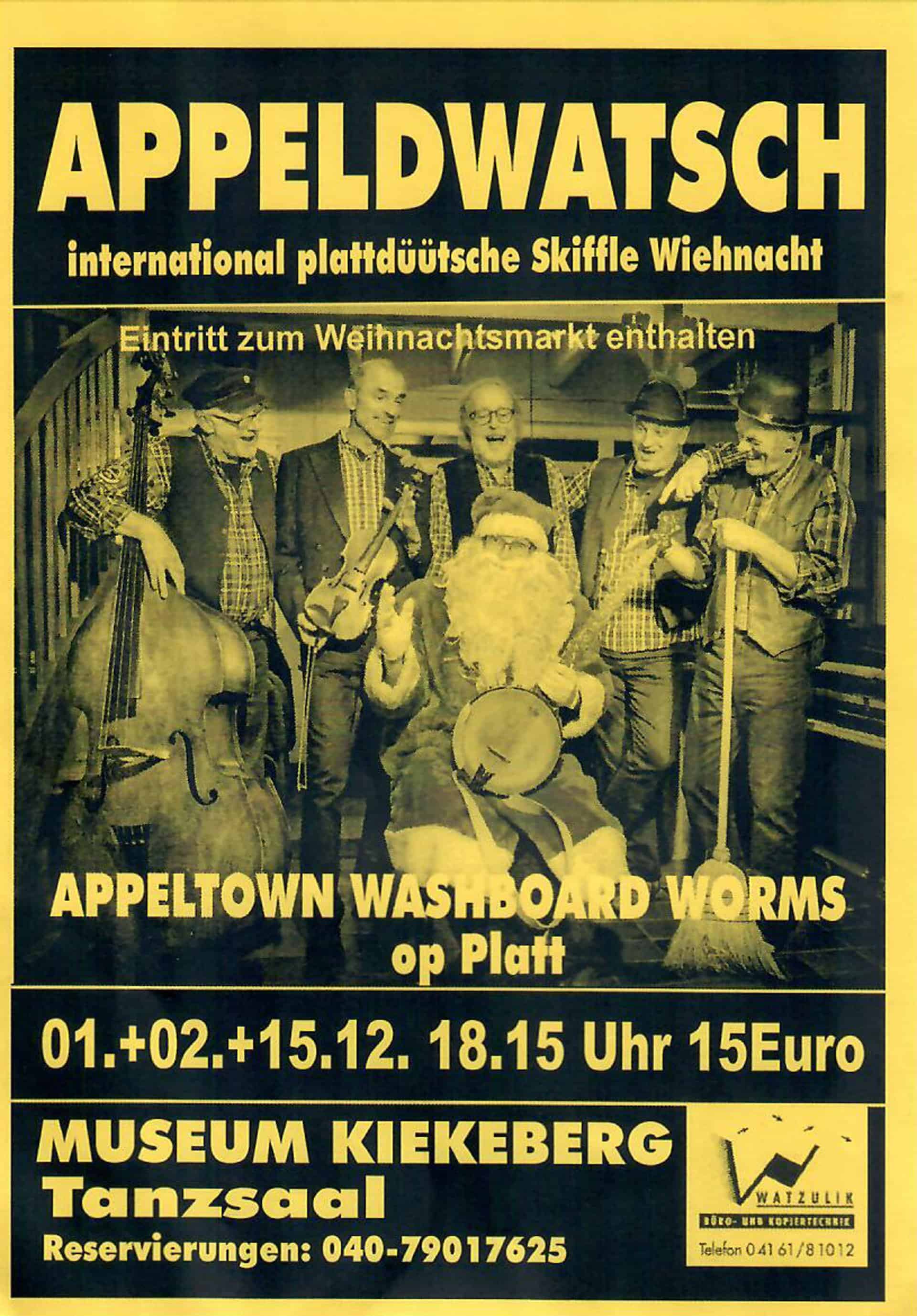 „Appeldwatsch“, auch bekannt als „Appeltown Washboard Worms“, machen seit 1982 erfolgreich Boogie-Woogie-Skiffle-Rock. Unter dem Namen „Appeldwatsch“ präsentieren sie ihre einzigartige Musik auf Platt. Neben fetzigen Bearbeitungen traditioneller plattdeutscher Lieder hat die Band weihnachtliche Songs im Skiffle- und Country-Sound im Repertoire. Dabei kommen abenteuerliche Instrumente wie Löffel, Ding Dong und Waschbrett zum Einsatz. Neben traditionellen plattdeutschen Liedern wie „Dat du mien Leevste büst“ oder „An de Eck steiht ´n Jung mit´n Tüdelband“ hört man auch eigene Texte der Band im fetzigen Skiffle-Rhythmus vom Leben auf dem Dorf, aber auch manch internationale Überraschung. Denn die Band besteht aus Musikern aus Norwegen, Österreich und Holland, die aus ihren Heimatländern weihnachtliche musikalische Bräuche auf die Bühne bringen.