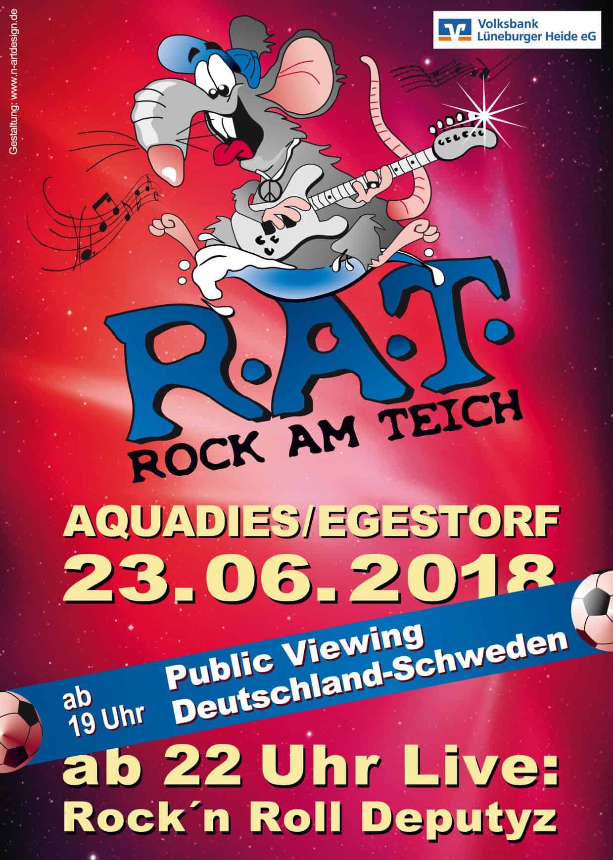 | €7,00Am 23. Juni findet am Aquadies in Egestorf „Rock am Teich“ statt. Ab 19 Uhr ist Public Viewing Deutschland-Schweden und ab 22 Uhr gibt´s Live „Rock´n Roll Deputyz“.