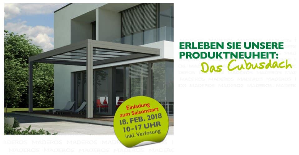 Am 18. Februar ist bei MADEROS in Nenndorf große Einladung zum Saisonstart. In der Zeit von 10.00 bis 17.00 Uhr ist die Ausstellung geöffnet. Es erwartet Sie die Produktneuheit „Das Cubusdach“ sowie eine Verlosung.