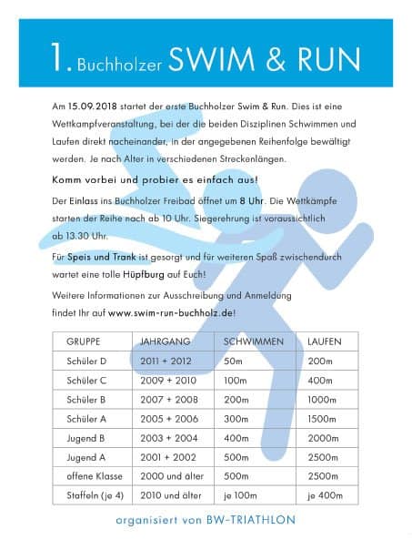 Am 15. September findet im Buchholzer Bad ab 9 Uhr „SWIM & RUN“ statt. Es wird um vorherige Anmeldung gebeten, da die Teilnehmerplätze begrenzt sind.
