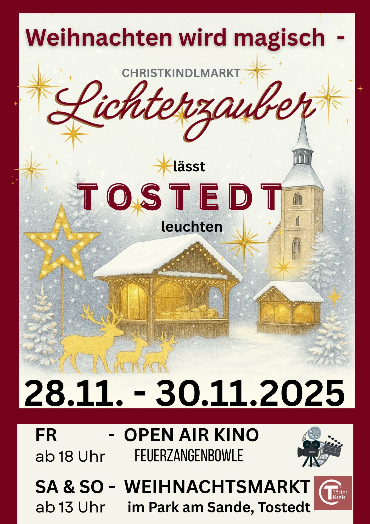 Bereits am Freitag, 28. November 2025, beginnt das Weihnachtswochenende in Tostedt mit der traditionellen Open-Air-Aufführung des Filmklassikers „Die Feuerzangenbowle“. Unter dem Motto „Vorglühen zum Christkindlmarkt Lichterzauber“ wird der Klassiker gezeigt – natürlich mit passendem Getränk im Ausschank.
