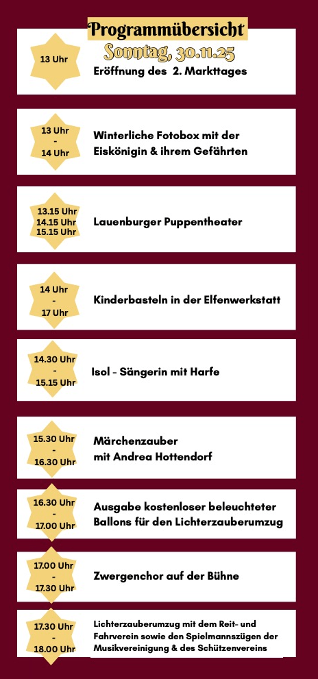 17.30–18.00 Uhr – Lichterzauberumzug mit Reit- und Fahrverein, Spielmannszügen der Musikvereinigung und dem Schützenverein. Leuchtende Ballons sorgen für strahlende Kinderaugen.