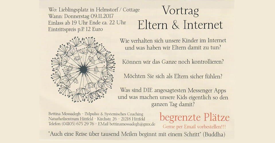 Am 9. November hält Bettina Mossadegh – IMpuls® & Systemisches Coaching in Helmstorf am Lieblingsplatz einen Vortrag zum Thema „Eltern & Internet“.