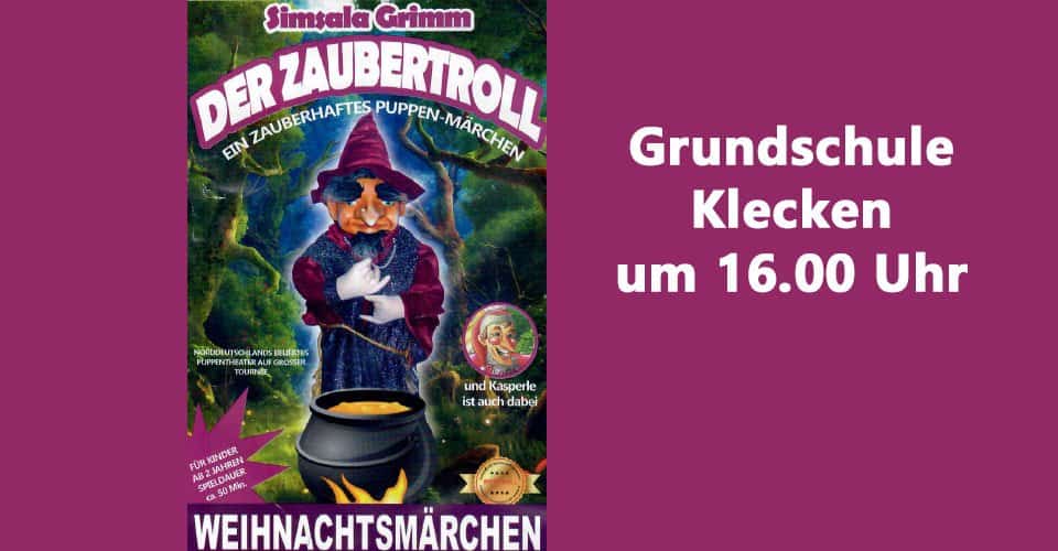 Grundschule Klecken Mühlenstraße 3, 21224 RosengartenAm 24. November findet um 16 Uhr in der Grundschule Klecken das zauberhafte Puppen-Märchen "Der Zaubertroll" statt. Für Kinder ab 2 Jahren. Die Spieldauer beträgt ca. 50 Minuten.