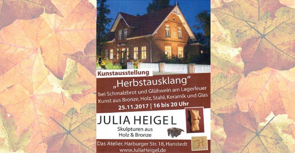 Das Atelier Harburger Straße 18, 21271 HanstedtAm 25. November findet von 16 bis 20 Uhr bei Julia Heigel in der Kunstausstellung der "Herbstausklang" mit Schmalzbrot und Glühwein am Lagerfeueuer statt.