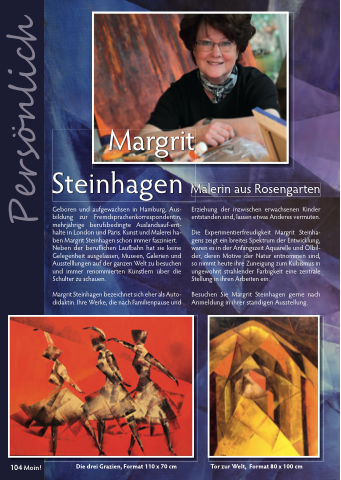 Geboren und aufgewachsen in Hamburg, Aus- bildung zur Fremdsprachenkorrespondentin, mehrjährige berufsbedingte Auslandsauf-ent- halte in London und Paris. Kunst und Malerei ha- ben Margrit Steinhagen schon immer fasziniert. Neben der beru ichen Lau ahn hat sie keine Gelegenheit ausgelassen, Museen, Galerien und Ausstelllungen auf der ganzen Welt zu besuchen und immer renommierten Künstlern über die Schulter zu schauen.