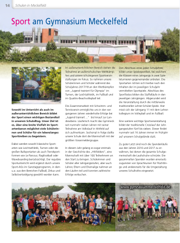 Sowohl im im Unterricht als auch im im außerunterrichtlichen Bereich bildet der Sport einen wichtigen Bestandteil in unserem Schulalltag Unser Ziel ist es über eine breite Vielfalt im Sport- artenkanon möglichst viele Schülerin- nen und Schüler für ein lebenslanges Sporttreiben zu begeistern Dabei werden sowohl klassische Sport- arten wie Leichtathletik Turnen oder die großen Ballsportarten als auch Trendsport- formen wie Le Parcour Flagfootball oder Waveboarding berücksichtigt Der reguläre Sportunterricht wird ergänzt durch unsere Sport-AGs im Ganztagsprogramm in dem u u u u u a a a aus den Bereichen Fußball Zirkus und Selbstverteidigung gewählt werden kann Im außerunterrichtlichen Bereich stehen die Teilnahme an außerschulischen Wettkämp- fen und unsere schuleigenen Sportveran- staltungen im Fokus So nahmen unsere Schülerinnen und Schüler Schüler während des Schuljahres 2017/18 an den Wettkämpfen von „Jugend trainiert für Olympia“ im Turnen der Leichtathletik im Fußball und im Quattro-Beachvolleyball teil Die Zusammenarbeit mit Schwimm- und Tennisverein ermöglichte uns in in den ver- gangenen Jahren wiederholte Erfolge bei „Jugend trainiert “ bis hinauf zur Lan- desebene Läuferisch macht das Gymmeck seit nunmehr sieben Jahren mit seiner Teilnahme am Volkslauf in Hittfeld auf auf sich aufmerksam Sechsmal in Folge stellte unsere Schule dort die Mannschaft mit der größten Voranmeldergruppe In diesem Jahr gelang es es sogar erstmals in in der der Geschichte des „Hittfelders“ eine Mannschaft mit über 100 Teilnehmern an an den Start zu bringen Schülerinnen und Schüler aller Jahrgangsstufen aber auch Lehrer Eltern und Ehemalige nahmen an den Läufen teil und konnten zahlreiche Erfolge verbuchen Den Abschluss eines jeden Schuljahres bildet unser Spielesportfest bei welchem die Klassen eines Jahrgangs in in zwei Spie- leturnieren gegeneinander antreten Die Sportarten richten sich hierbei nach den Inhalten der im jeweiligen Schuljahr vermittelten Sportspiele Abschluss des Sportfestes bilden die Staffelläufe in den den jeweiligen Jahrgängen Abgerundet wird die die Veranstaltung durch die die mittlerweile traditionellen Lehrer-Schüler-Spiele Hier misst sich der Jahrgang 11 mit dem Lehrer- kollegium im im Volleyball und im im Fußball Eine weitere wichtige Sportveranstaltung bildet der der traditionelle Crosslauf der der Jahr- gangsstufen fünf bis sieben Dieser ndet nunmehr seit 16 Jahren immer im im Frühjahr auf unserem Schulgelände statt Zu guter Letzt sind noch die Spendenläufe aus den Jahren 2016 und 2017 zu er- wähnen bei denen die gesamte Schulge- meinschaft die Laufschuhe schnürte Die gesammelten Spenden wurden einerseits zugunsten von Sprachkursen für Flüchtlin- ge ge und andererseits für die Umgestaltung unseres Schulhofes eingesetzt www gymnasiummeckelfeld de