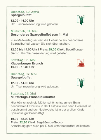 Zum Maifeiertag serviert die Hofküche ein besonderes Spargelbuffet! Lassen Sie sich überraschen.