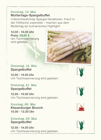 Unterschiedlichste Spargel-Variationen, frisch in der Hofküche zubereitet – machen aus dem Muttertag ein kulinarisches Highlight!