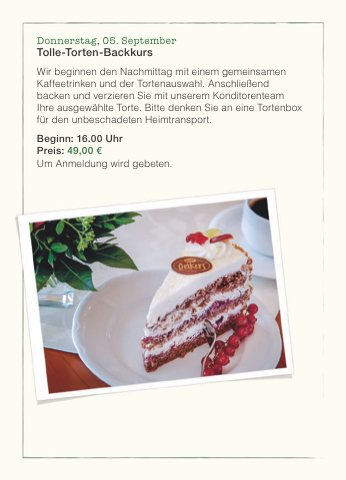 Wir beginnen den Nachmittag mit einem gemeinsamen Kaffeetrinken und der Tortenauswahl. Anschließend backen und verzieren Sie mit unserem Konditorenteam Ihre ausgewählte Torte. Bitte denken Sie an eine Tortenbox für den unbeschadeten Heimtransport.