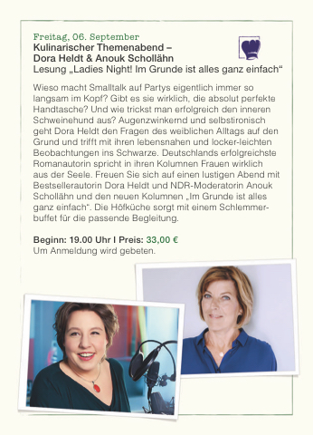 Wieso macht Smalltalk auf Partys eigentlich immer so langsam im Kopf? Gibt es sie wirklich, die absolut perfekte Handtasche? Und wie trickst man erfolgreich den inneren Schweinehund aus? Augenzwinkernd und selbstironisch geht Dora Heldt den Fragen des weiblichen Alltags auf den Grund und trifft mit ihren lebensnahen und locker-leichten Beobachtungen ins Schwarze. Deutschlands erfolgreichste Romanautorin spricht in ihren Kolumnen Frauen wirklich aus der Seele. Freuen Sie sich auf einen lustigen Abend mit Bestsellerautorin Dora Heldt und NDR-Moderatorin Anouk Schollähn und den neuen Kolumnen „Im Grunde ist alles ganz einfach“. Die Höfküche sorgt mit einem Schlemmer- buffet für die passende Begleitung.