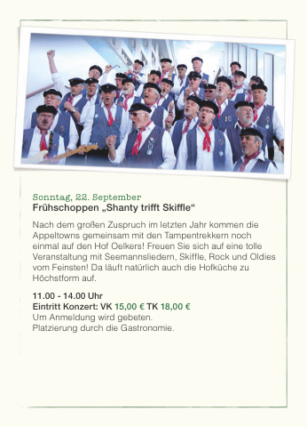 Nach dem großen Zuspruch im letzten Jahr kommen die Appeltowns gemeinsam mit den Tampentrekkern noch einmal auf den Hof Oelkers! Freuen Sie sich auf eine tolle Veranstaltung mit Seemannsliedern, Skif e, Rock und Oldies vom Feinsten! Da läuft natürlich auch die Hofküche zu Höchstform auf.