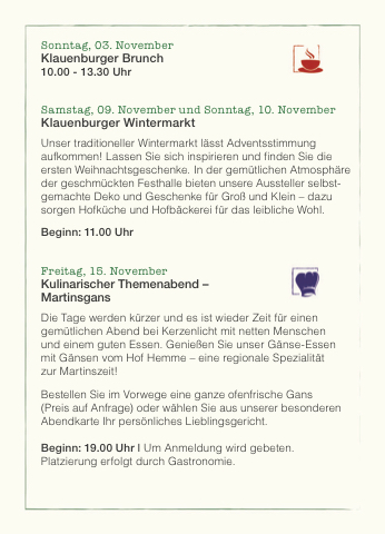 Die Tage werden kürzer und es ist wieder Zeit für einen gemütlichen Abend bei Kerzenlicht mit netten Menschen und einem guten Essen. Genießen Sie unser Gänse-Essen mit Gänsen vom Hof Hemme – eine regionale Spezialität zur Martinszeit!