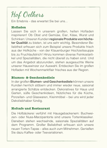 Lassen Sie sich in unserem großen, hellen Hofladen inspirieren! Ob Obst und Gemüse, Eier, Käse, Wurst und Schinken: Unseren Kunden regionale Produkte von höchs- ter Qualität zu bieten, ist uns sehr wichtig. Besonderer Be- liebtheit erfreuen sich zum Beispiel unsere Produkte frisch aus der Hofküche - von der Klauenburger Hochzeitssuppe bis zu Fruchtaufstrich! Hinzu kommen diverse Feinkostarti- kel und Spezialitäten, die nicht überall zu haben sind. Und um das Angebot abzurunden, stehen ausgesuchte Weine unserer Hauswinzer zur Auswahl. Entdecken Sie im großen Ho aden mit Wochenmarkt air frisches aus der Region.