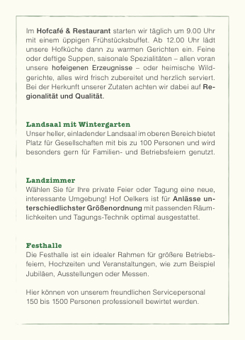Wählen Sie für Ihre private Feier oder Tagung eine neue, interessante Umgebung! Hof Oelkers ist für Anlässe un- terschiedlichster Größenordnung mit passenden Räum- lichkeiten und Tagungs-Technik optimal ausgestattet.