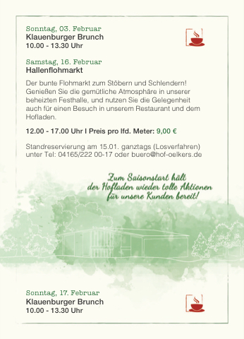 Der bunte Flohmarkt zum Stöbern und Schlendern! Genießen Sie die gemütliche Atmosphäre in unserer beheizten Festhalle, und nutzen Sie die Gelegenheit auch für einen Besuch in unserem Restaurant und dem Ho aden.