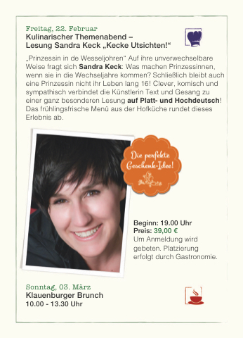 „Prinzessin in de Wesseljohren“ Auf ihre unverwechselbare Weise fragt sich Sandra Keck: Was machen Prinzessinnen, wenn sie in die Wechseljahre kommen? Schließlich bleibt auch eine Prinzessin nicht ihr Leben lang 16! Clever, komisch und sympathisch verbindet die Künstlerin Text und Gesang zu einer ganz besonderen Lesung auf Platt- und Hochdeutsch! Das frühlingsfrische Menü aus der Hofküche rundet dieses Erlebnis ab.
