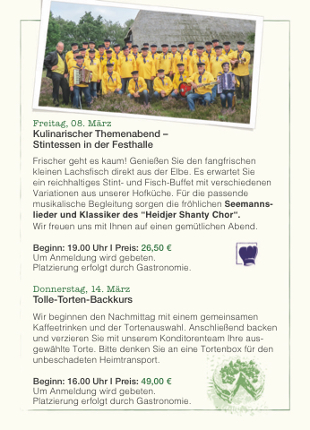 ein reichhaltiges Stint- und Fisch-Buffet mit verschiedenen Variationen aus unserer Hofküche. Für die passende musikalische Begleitung sorgen die fröhlichen Seemanns- lieder und Klassiker des “Heidjer Shanty Chor“.